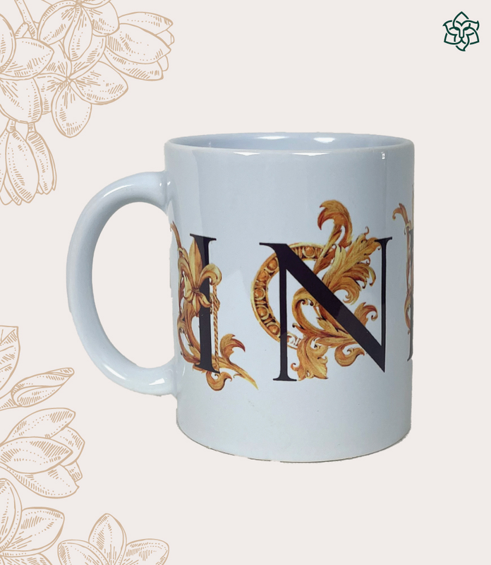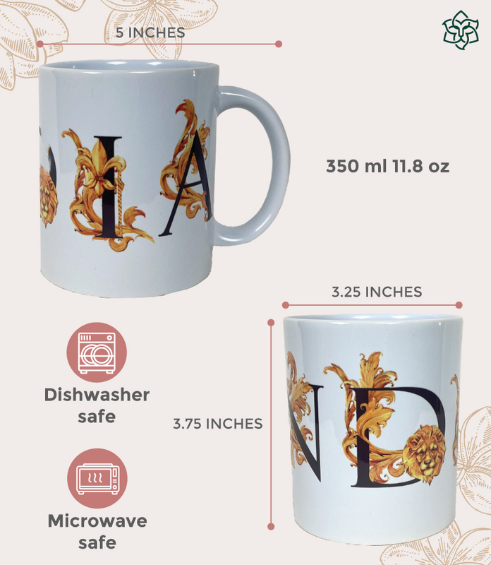 Enjoy coffee in this oversized India souvenir mug. The stylish typography is intertwined with gold baroque elements featuring a lion head at the center.This mug makes for a great gift from India to the coffee lover in your life.