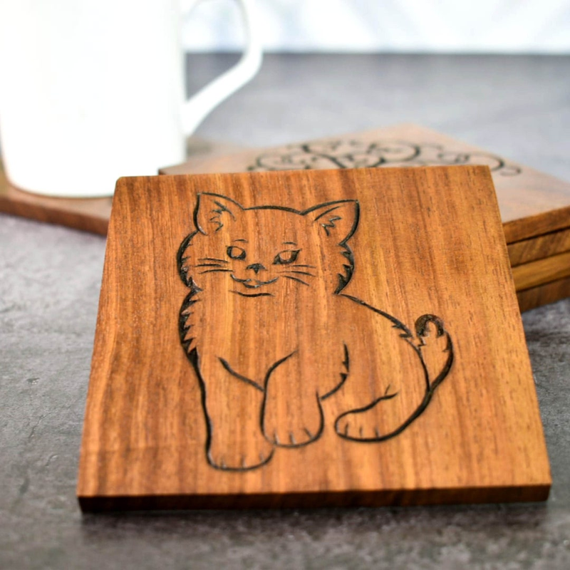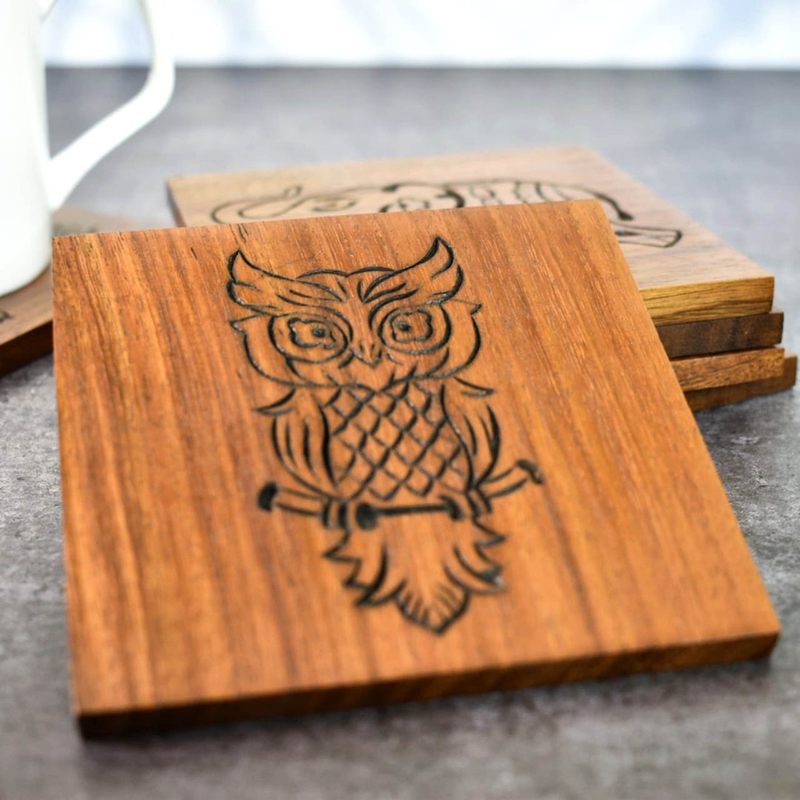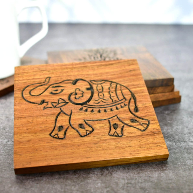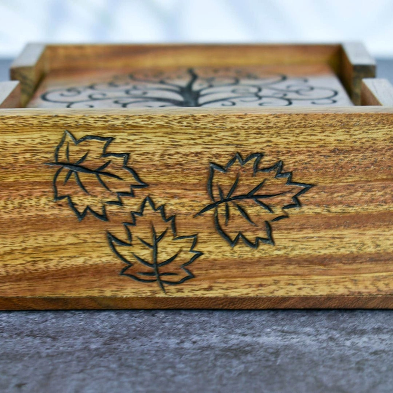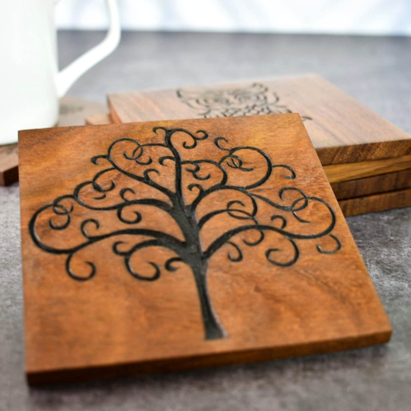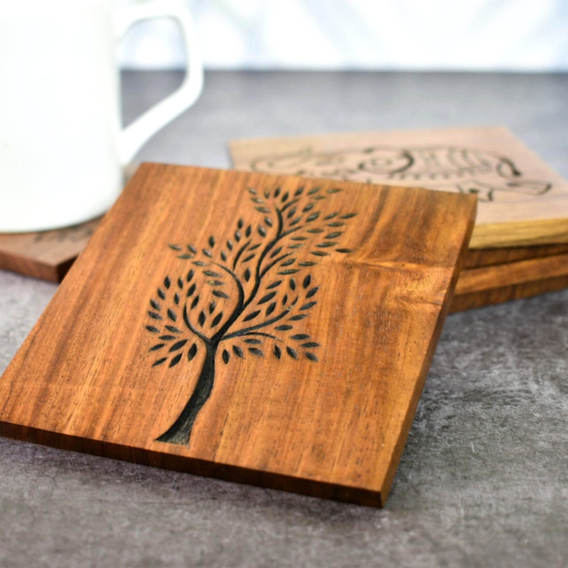Natural Hardwood Drink Coasters -Hand carved 6 Pack, Coasters for Tea Cups Coffee Mugs Beer Cans Bar Tumblers and Water Glasses